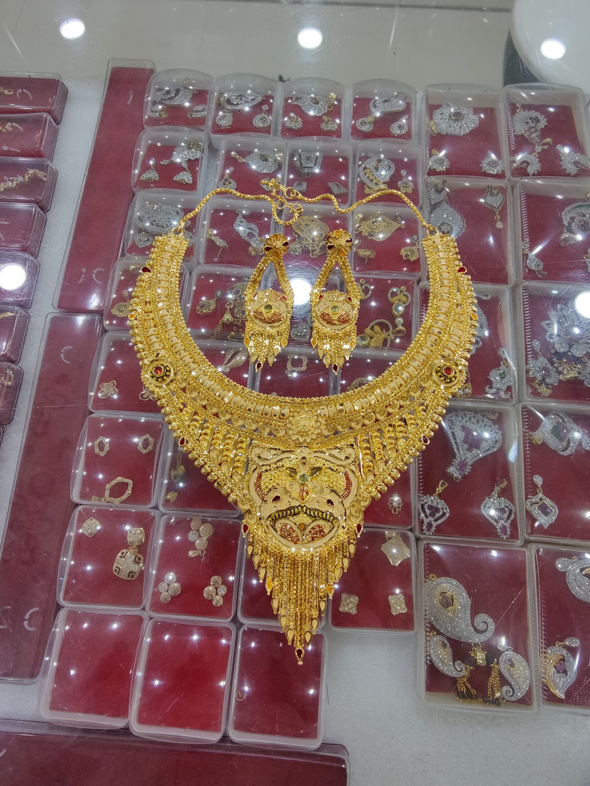 TJP Stylish Gold Plated Long Haram Necklace Set for Women is made of Alloy. Women love jewellery; specially traditional jewellery adore a women. They wear it on different occasion. They have special importance on ring ceremony, wedding and festive time. They can also wear it on regular basics. Make your moment memorable with this range. This jewel set features a unique one of a kind traditional embellish with antic finish.